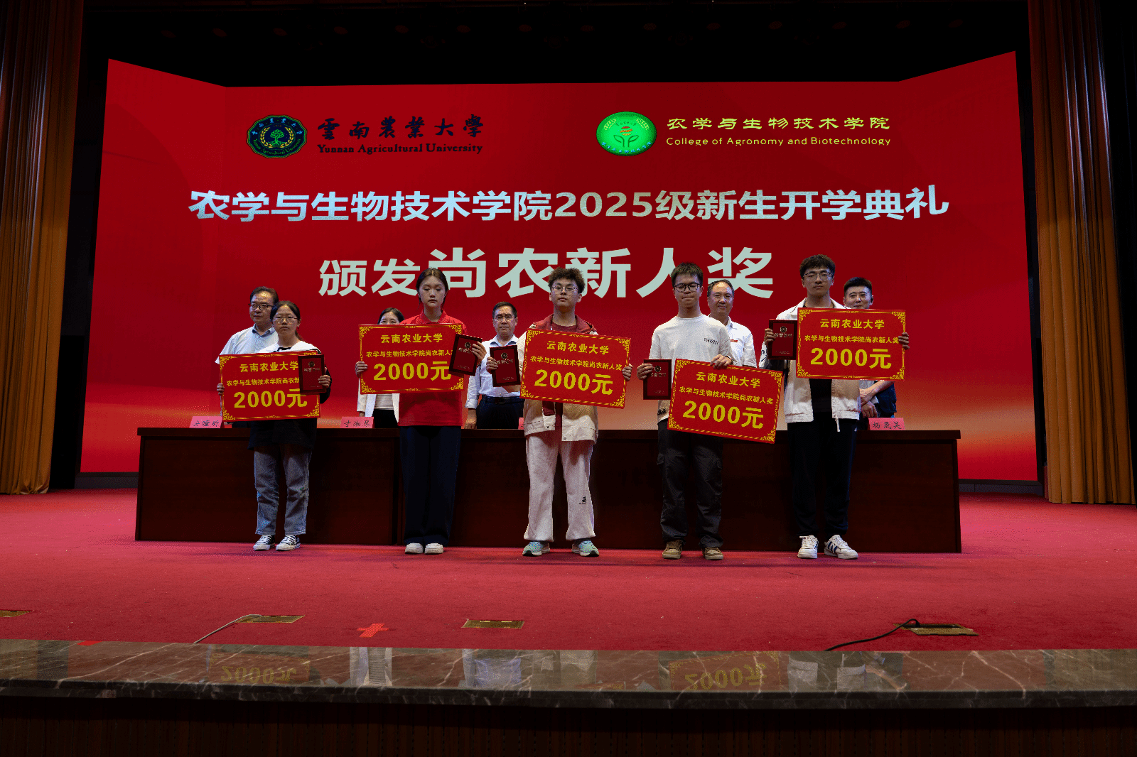 大会在庄严的国歌声中拉开帷幕。安曈昕副书记代表学院向全体新生表示热烈欢迎,并向辛勤耕耘的教师们致以节日的问候和崇高敬意。2022级农学专业丁晓瑶同学作为老生代表分享学习心得与成长感悟;2025级智慧农业专业王思睿同学代表新生发言,表达了对大学生活的憧憬与立志成才的决心。学院与“尚农新人奖”赞助企业褚氏农业为新生代表颁发“尚农新人奖”,勉励全体新生笃行不怠。