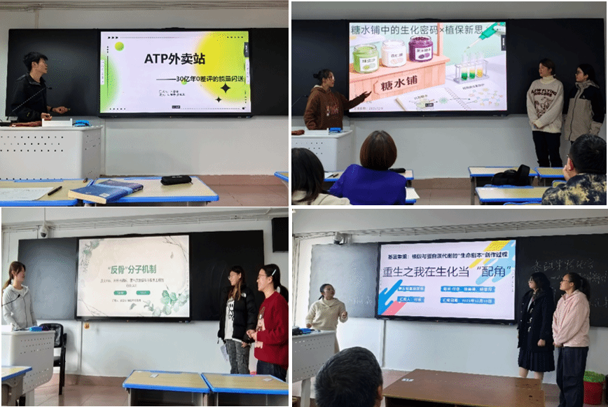 主管教学负责人及教学秘书组成评价组,对学生学习成果进行现场评价。各小组以“ATP外卖站”“糖水铺子”“反骨分子机制”“核酸情报局”“小明减肥记”“基因重组—重生之我在生化当‘配角’”“香归银豪”等鲜活的名字为题目,借助图文并茂的PPT,将四大类生物大分子的代谢及分子调控等生化核心内容,与植物病理、绿色防控、抗逆育种等前沿及实际应用紧密结合,实现了从理论到实践、从学习到创新的跨越。