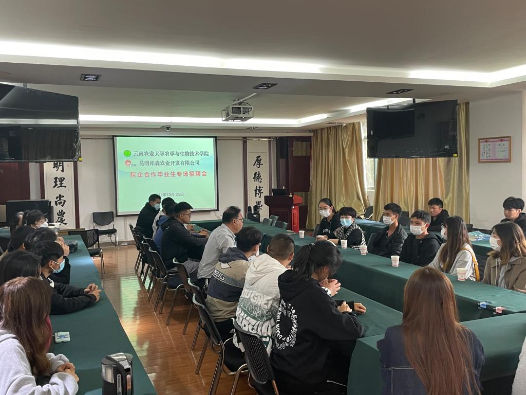 合作企业昆明库森农业开发有限公司进行“院企合作毕业生专场招聘会”,会议由学院副书记安曈昕老师主持。会上安老师与昆明库森农业开发有限公司负责人赵朝琼进行了详细会谈,逐一了解企业的用工需求、招聘要求、及提供的工资待遇等方面问题。同时还有色情导航