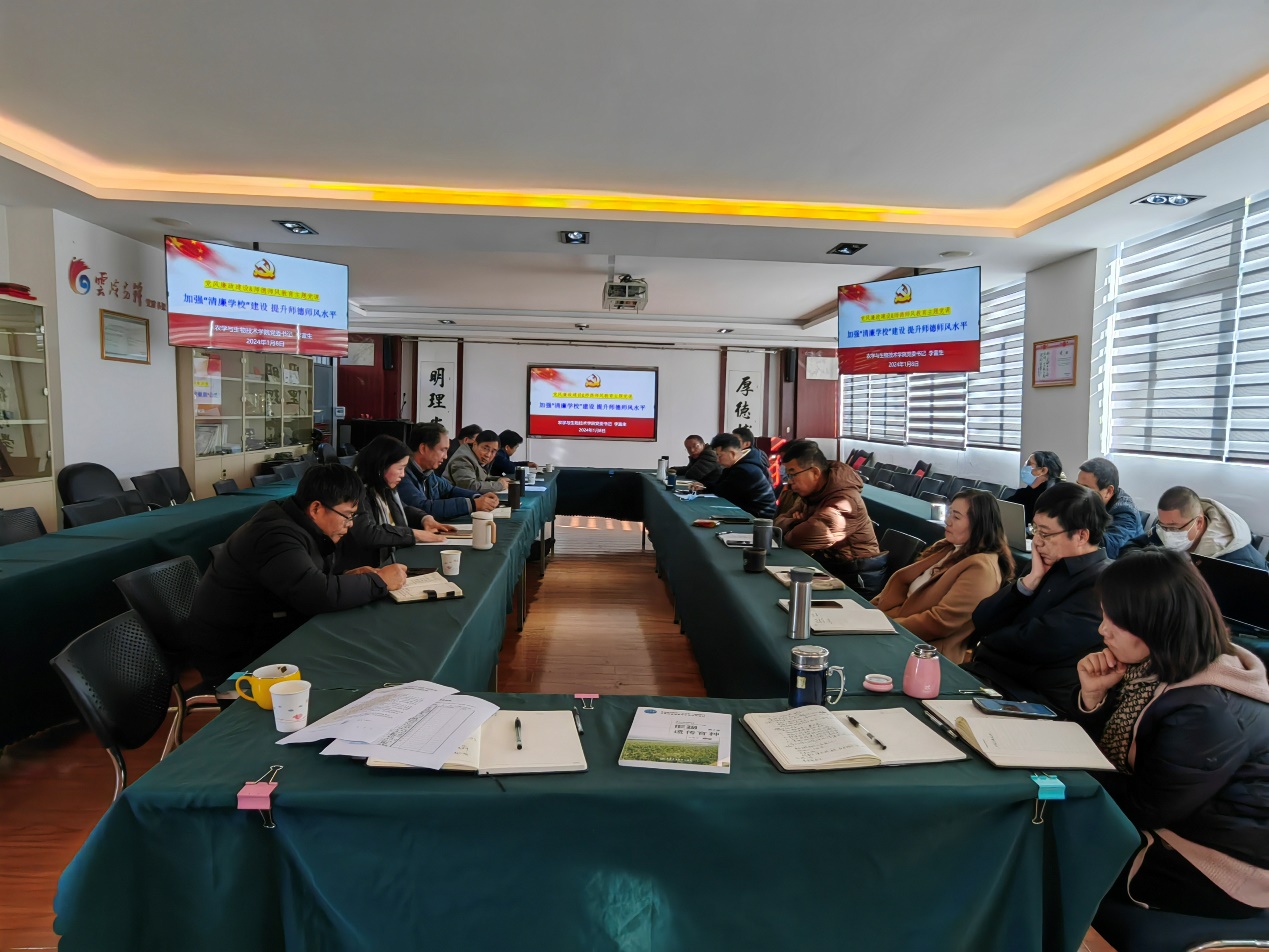 委员会关于印发深化推进“清廉学校”建设系列行动工作方案的通知》精神,结合学院参观学习廉洁文化园和“廉润云农清风正扬”主题展览情况,1月8日,院党委理论学习中心组(扩大)以“加强清廉学校建设提升师德师风水平”为主题开展2024年第一次集体学习会议。会议由党委书记李富生主持,党委委员、领导班子、各党支部书记、各系、所、中心和部门负责人参加学习。