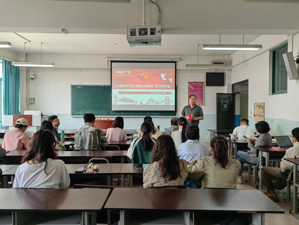 委员会关于开展党纪学习教育的实施方案》精神,农学与生物技术学院教工第二党支部于2024年5月12日开展了专题读书班学习和交流研讨,会议由支部书记刘良燕主持,22名党员参加了本次专题读书班交流学习。