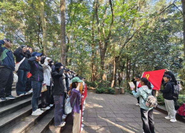 全体党员、入党积极分子在党旗的引领下,沿着蜿蜒的山路徒步前行。途中经过耸立在苍松翠柏之中的南洋华侨机工抗日纪念碑。在纪念碑前,全体同志一起重温入党誓词,党支部书记希从芳同志为党员同志颁发政治生日贺卡,并要求全体党员应时刻铭记历史,缅怀先烈,提升爱国主义情怀,时刻牢记自己的责任与使命。