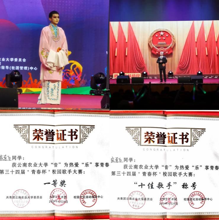在比赛中,三位选手以饱满的情感和卓越的唱功,赢得评委和观众的一致好评。2021级农学2班的李南同学演唱了《红尘客栈》《空白格》《指纹》,字字句句间流露着对人生的感悟,最终荣获大赛风采奖。来自2021级中草药栽培与鉴定专业的益西拉姆同学,以《innocence》《世界上的另一个我》两首曲目征服全场,获得三等奖和"十佳歌手"称号。2023级农艺与种业硕士研究生皮齐飞同学则以《越人歌》《梨花颂》《霸王别姬》《把一切献给党》四首曲目惊艳四座,他的演唱展现了中华民族传统文化的深厚底蕴和隽永魅力,抒发了革命年代共产党员浴血奋战、矢志不渝的坚定信念和决心,令人动容。最终荣获大赛唯一一等奖和"十佳歌手"桂冠。
